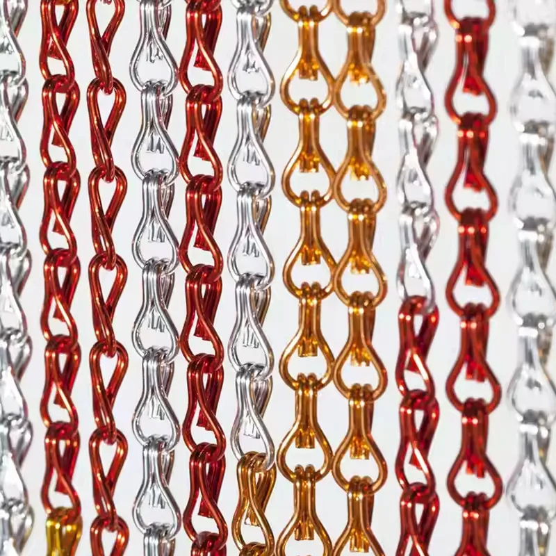 Kettingschakelgordijnen, ook wel kettingschermen of metalen kettinggordijnen genoemd, zijn gemaakt van 100% aluminium. Ze kunnen de originele kleur van aluminium behouden en kunnen in verschillende kleuren worden geanodiseerd. Ze zijn ook een zeer populair hoogwaardig metalen gordijn voor binnen- en buitendecoratie. Als decoratief scherm of scheidingswand is het zowel functioneel als mooi, geschikt voor residentiële of verschillende commerciële plaatsen.